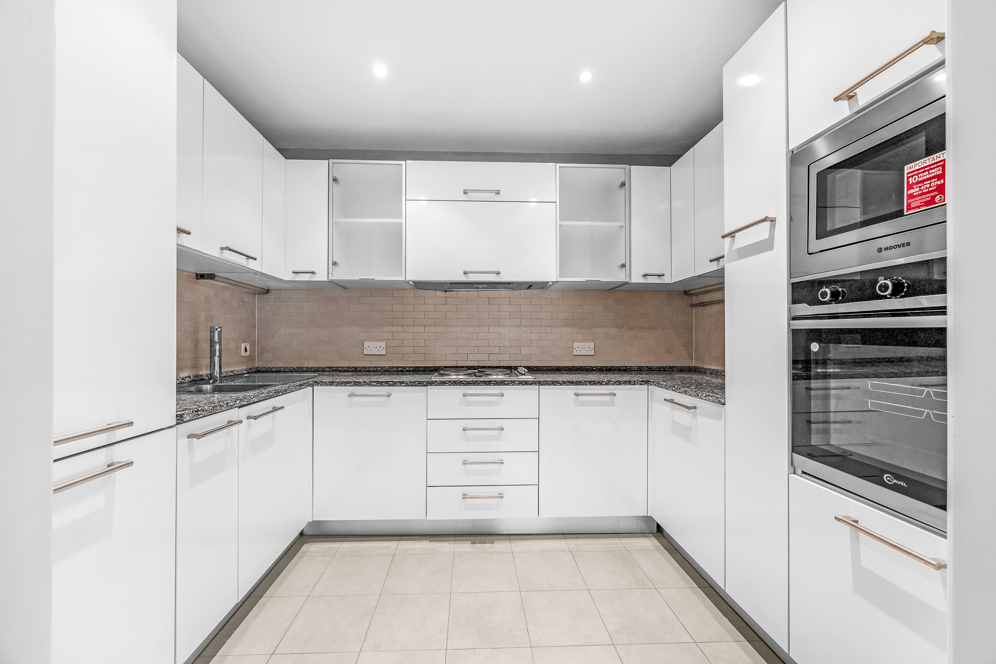 Tiled floor and tiled splashback, built in high gloss wall and floor units, granite countertop, stainless steel sink with draining board, Fusion integrated dishwasher, four ring electric hob, Flavel integrated oven, Hoover integrated Microwave, extractor fan, Powerpoint fridge freezer, recessed lighting.