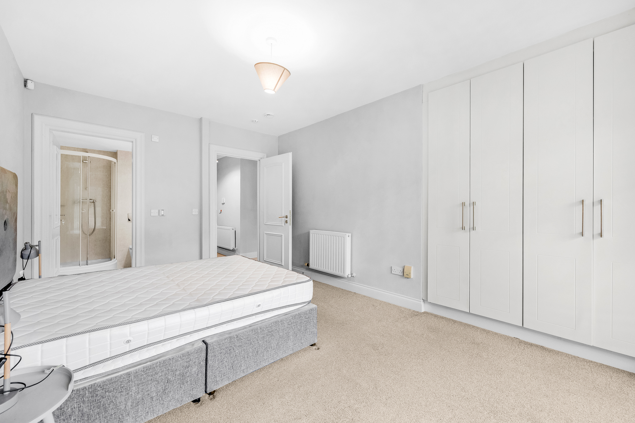 Laminate floor, large built-in wardrobe, ceiling light, French doors to terrace.
