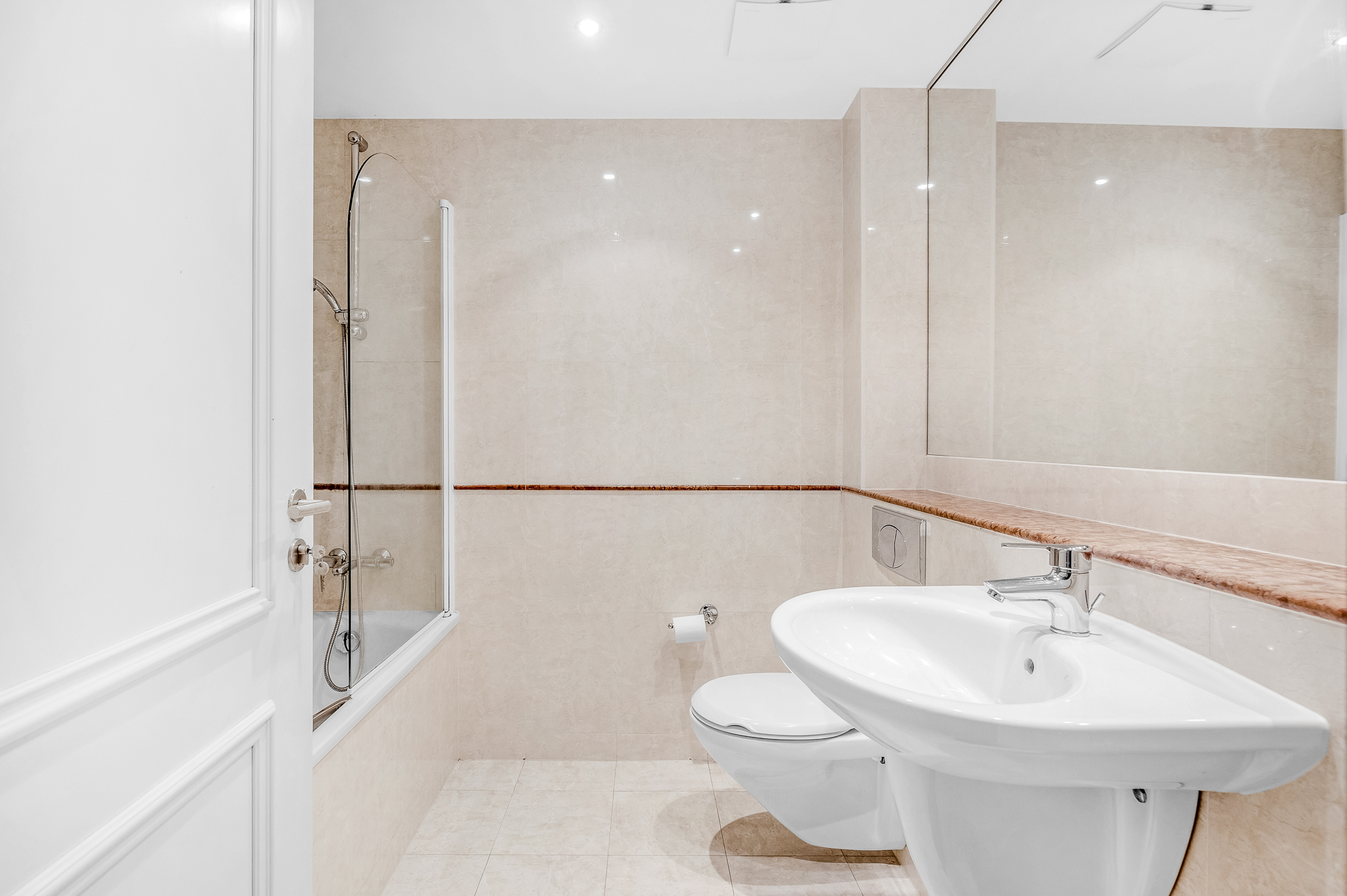 Tiled floor and walls, wall mounted sink, bath, bath screen, wall hung w.c, granite shelf, mirror, recessed lighting, extractor fan.