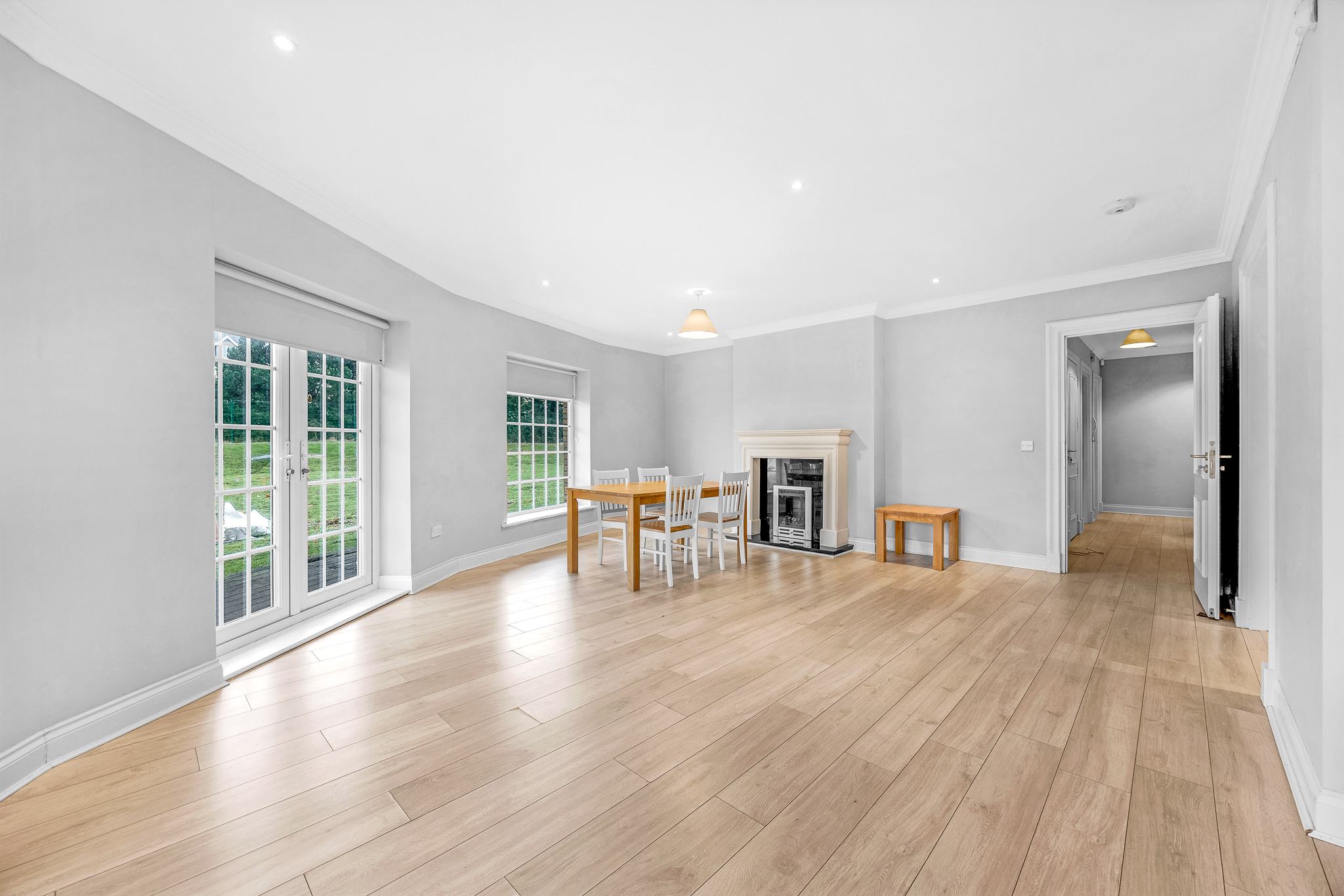 Laminate floor, recessed lighting, ceiling light, sandstone fire surround with granite hearth and insert and gas fire, French doors to terrace.