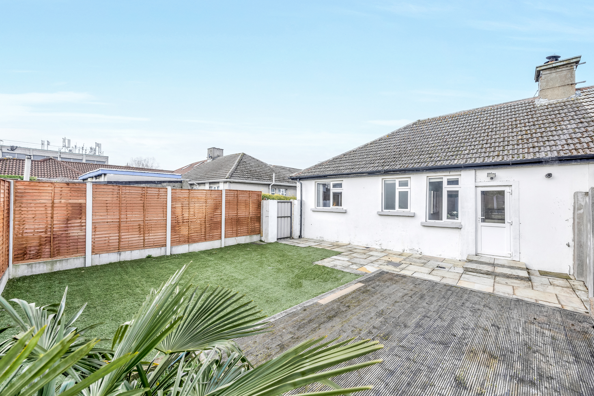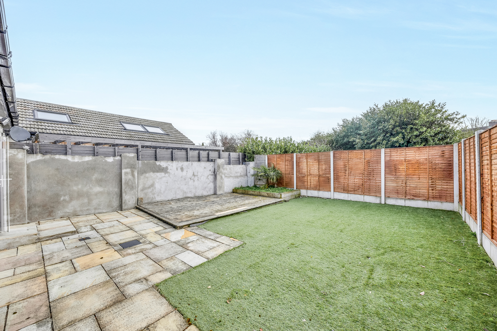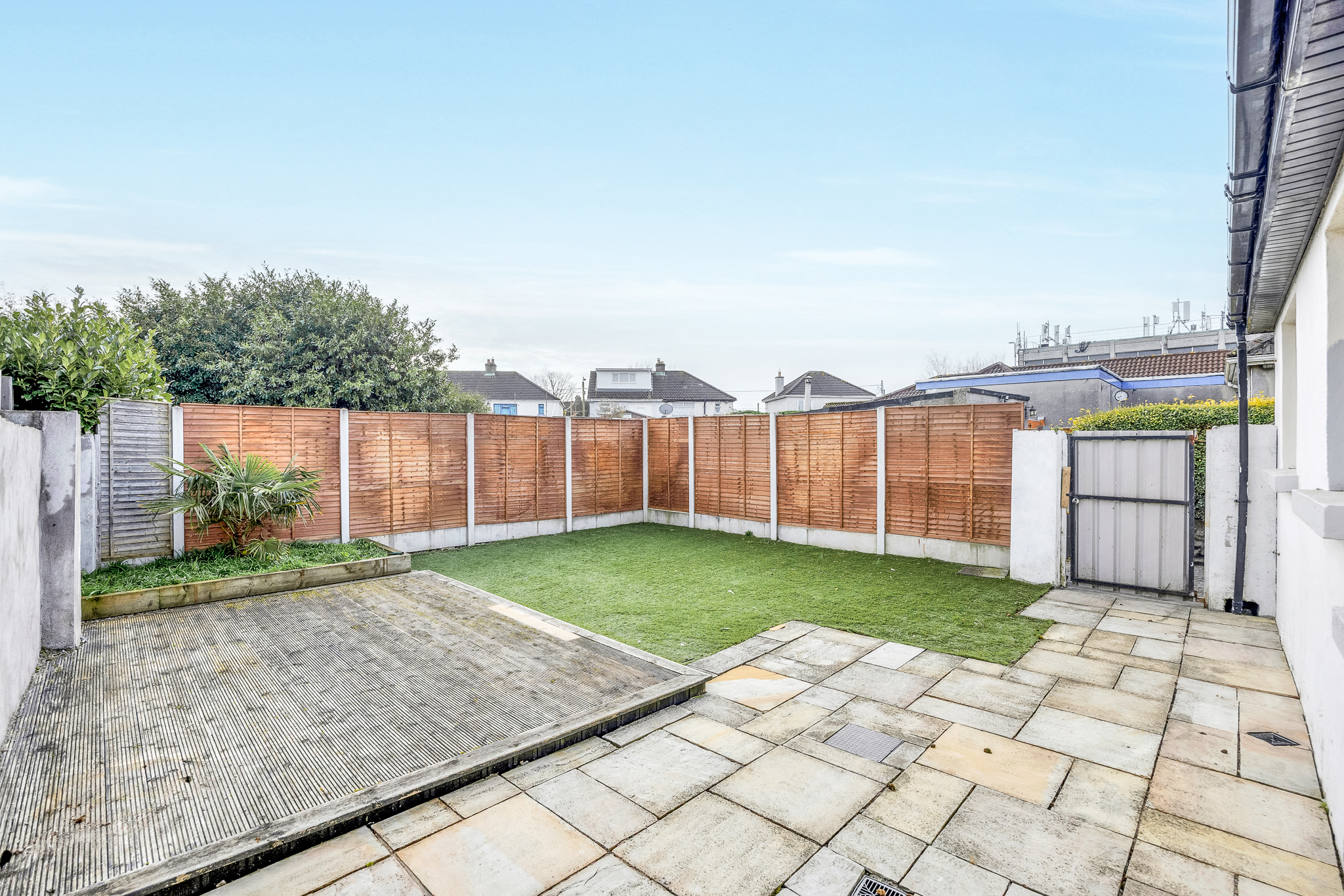 Laid out with an Indian Sandstone terrace, artificial lawn, decking and planted raised beds. Gated pedestrian access to side.