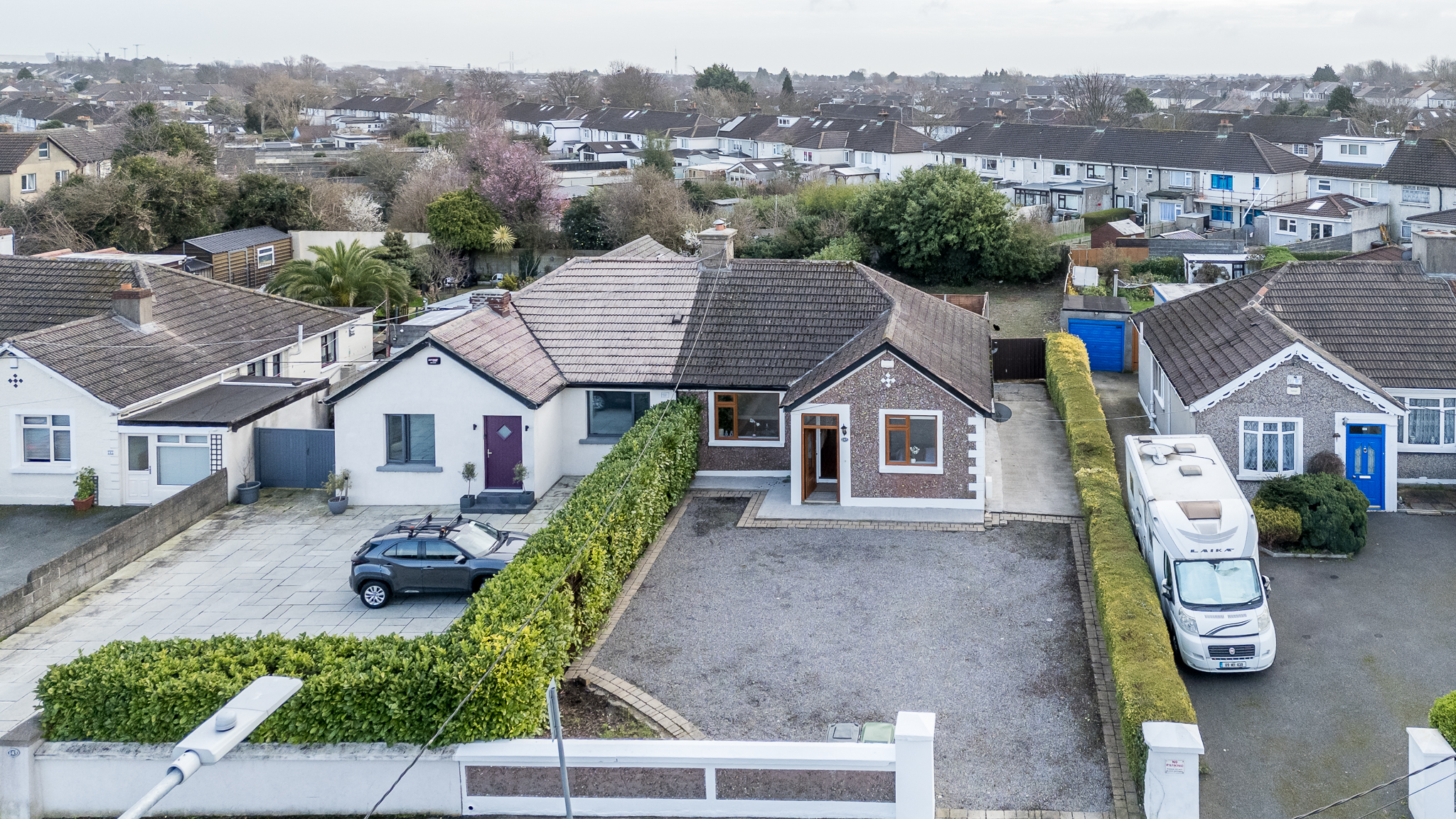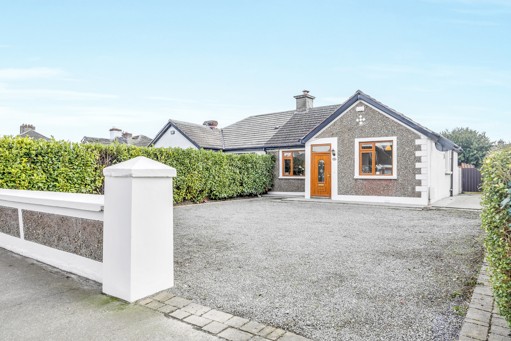 Generous walled, railed and gravelled parking area with cobblelock edging and gated vehicle side access to the rear site.