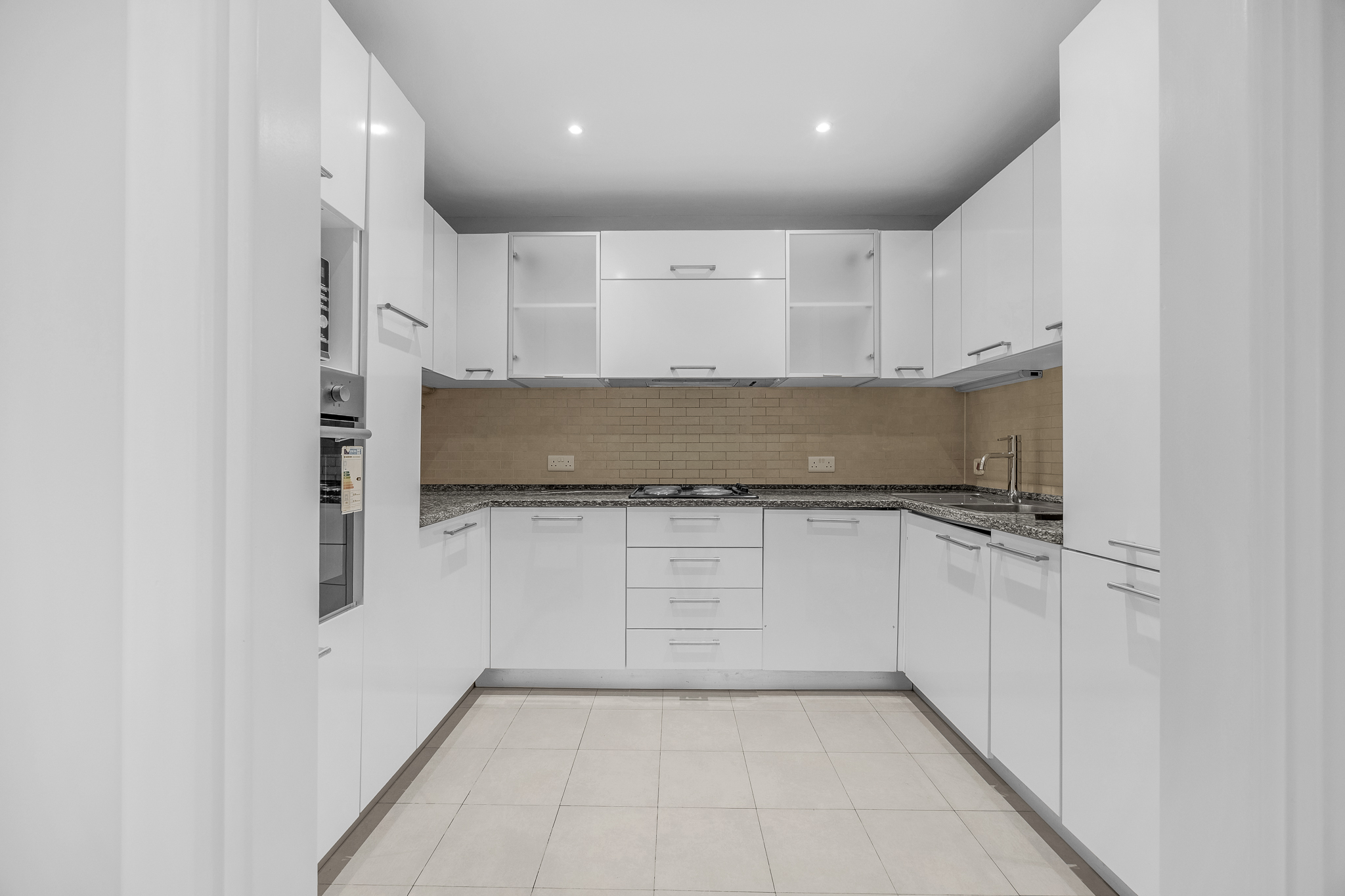 Tiled floor and splashback, built in wall and floor units, granite worktop and upstand, Hoover integrated oven, Candy dishwasher, four ring electric hob, Servis 70:30 fridge freezer, stainless steel sink, recessed lighting, pull out larder drawers.