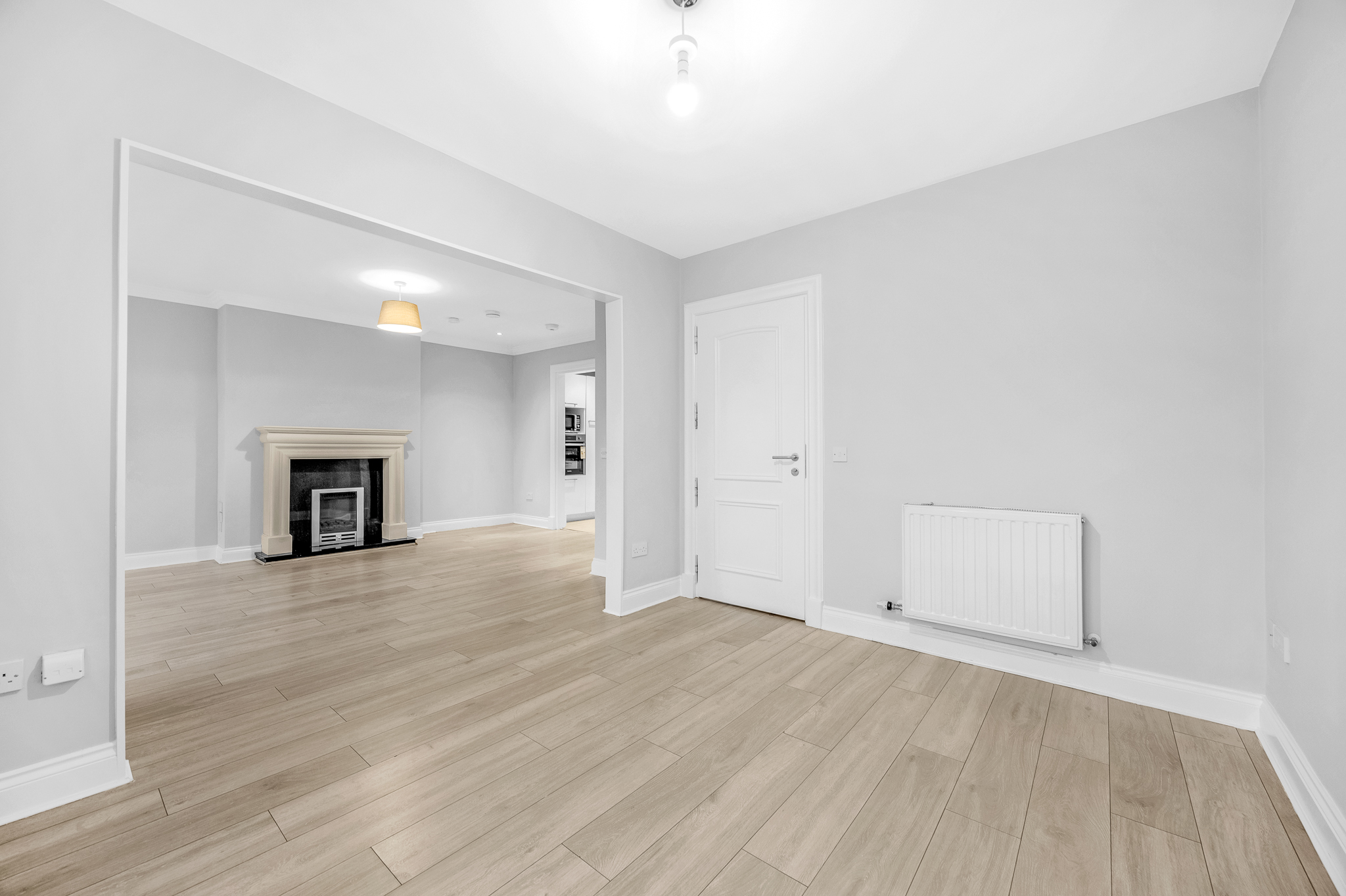 Laminate floor, ceiling light, recessed lighting, feature quartz fire surround with inset gas fire and granite hearth, logic ideal gas boiler, French doors to balcony.