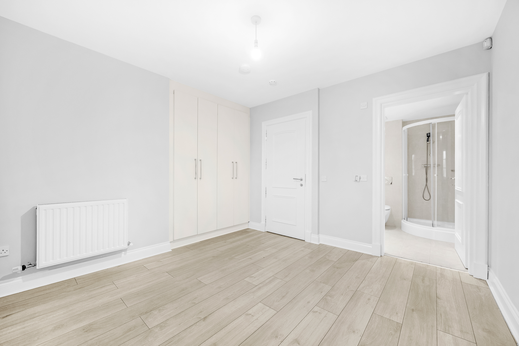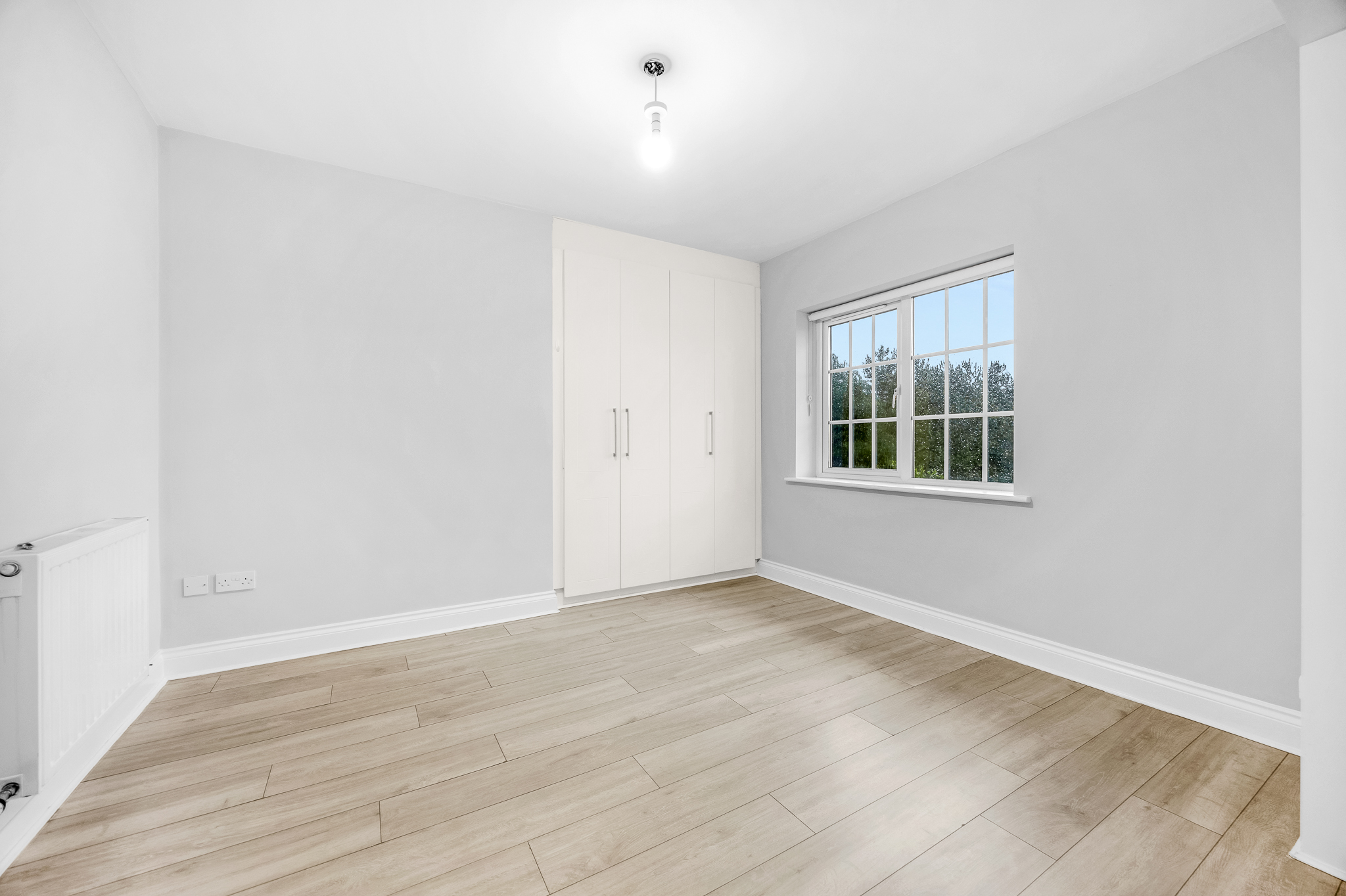 Laminate floor, ceiling light, large built-in wardrobe