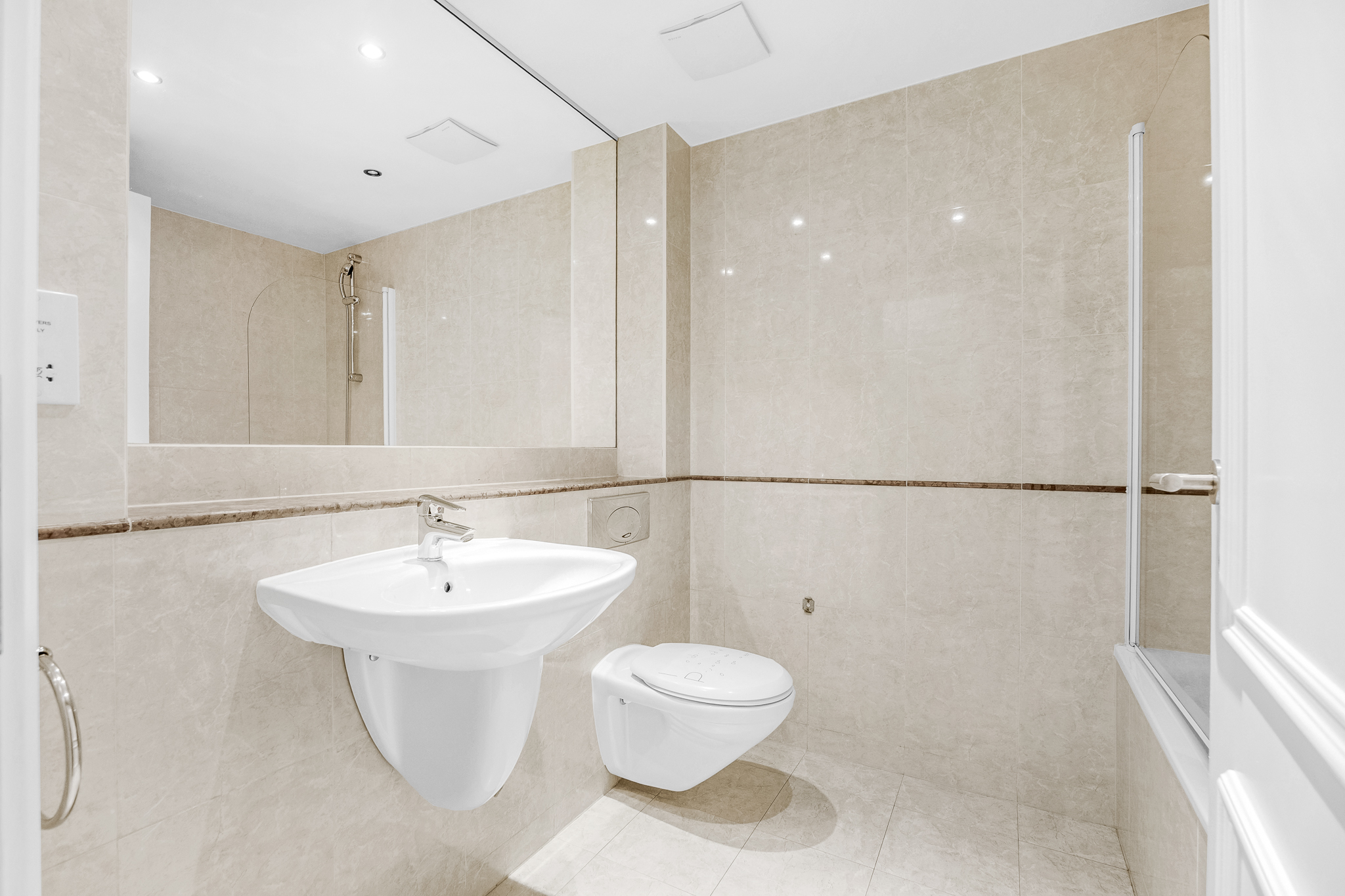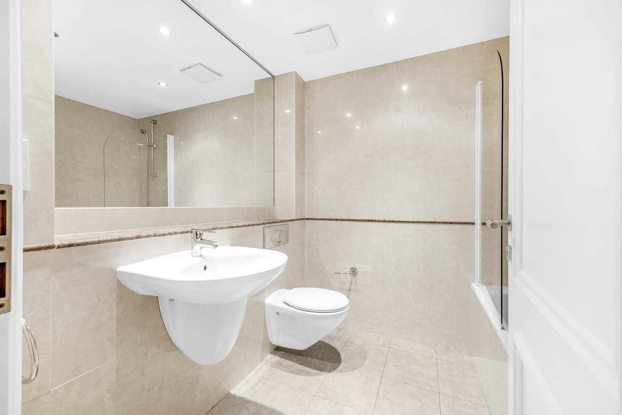 Tiled floor and walls, bath, bath screen, wall mounted sink, W.C, mirror, extractor fan, shaving light, recessed lighting, chrome towel ring.