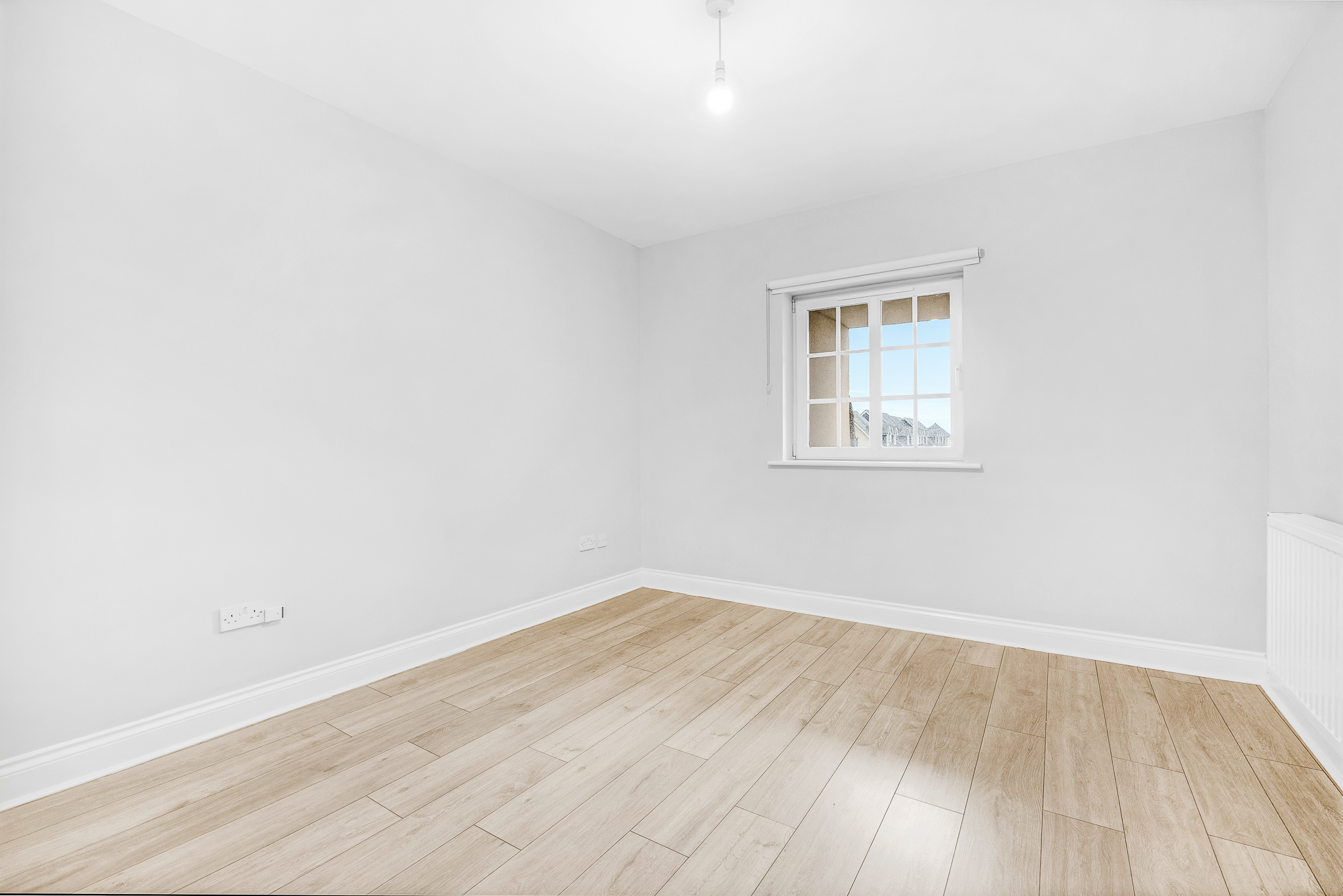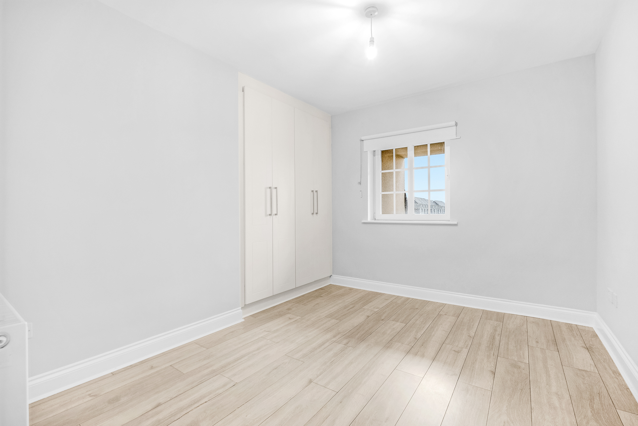 Laminate floor, ceiling light, large built-in wardrobe, window blind.