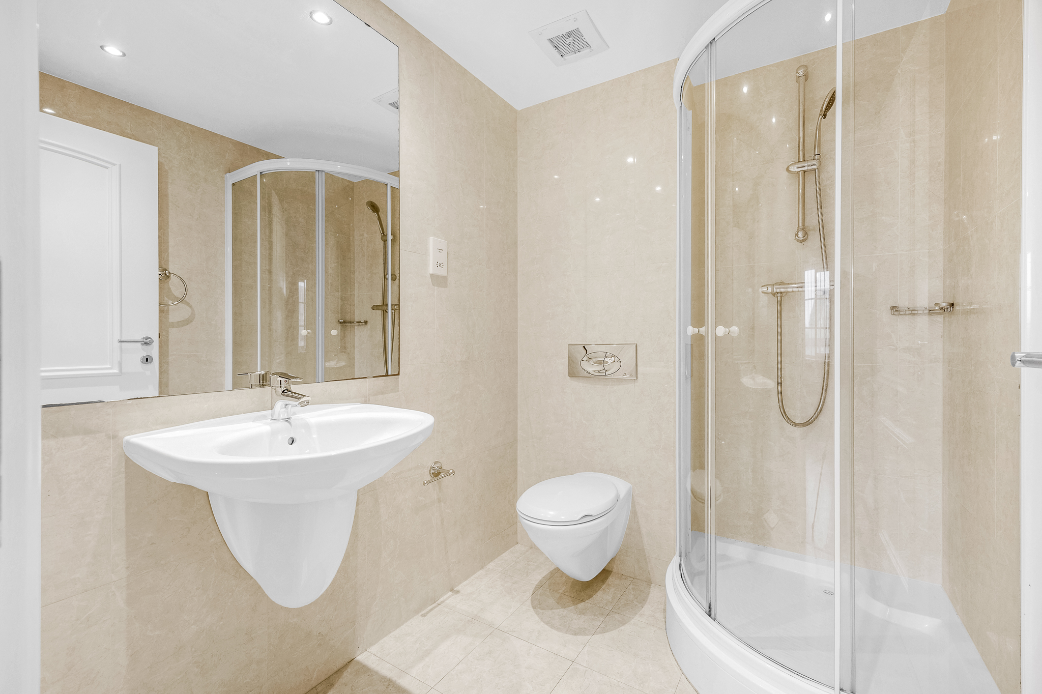 Tiled floor and walls, W.C, wall hung sink, corner shower enclosure, mirror, recessed lighting, extractor fan, chrome towel ring, shaving socket.