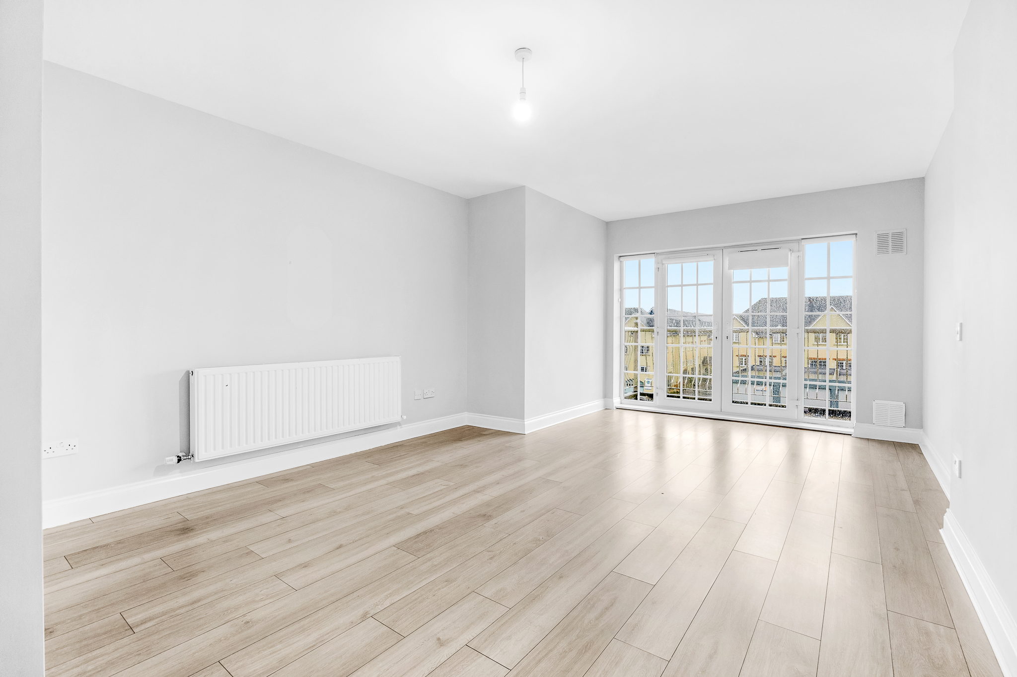 Laminate floor, ceiling light, French doors to balcony.