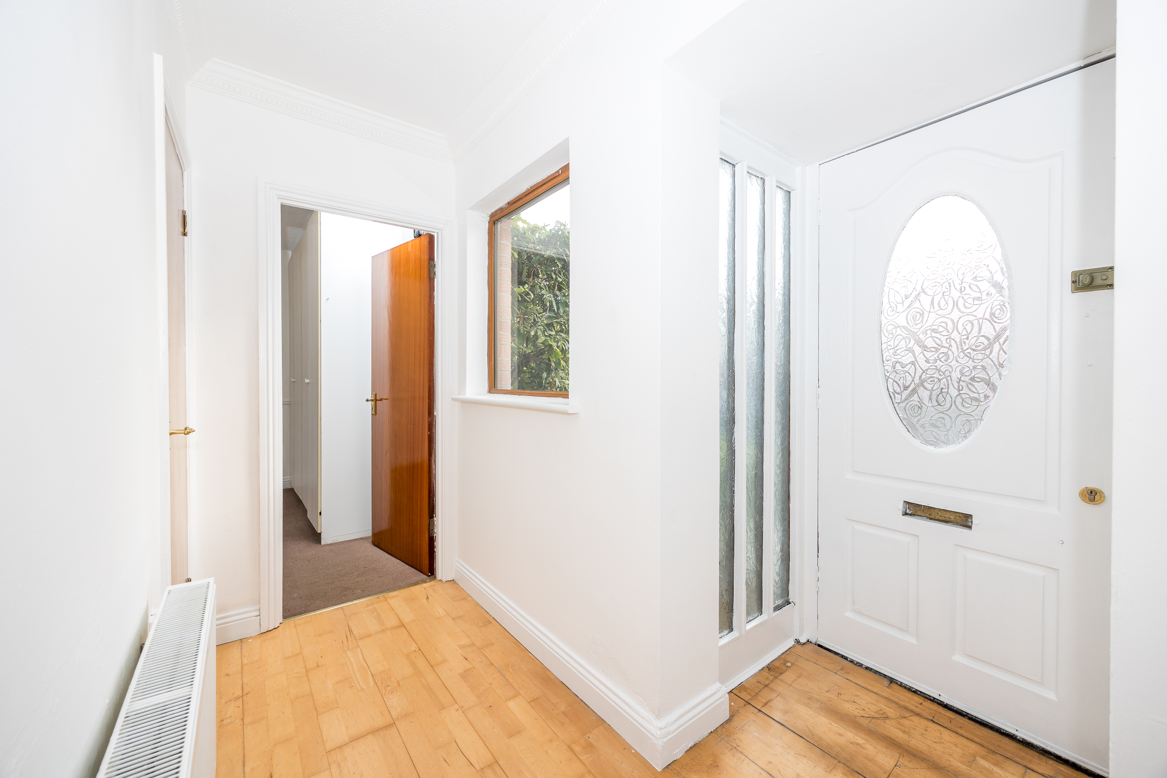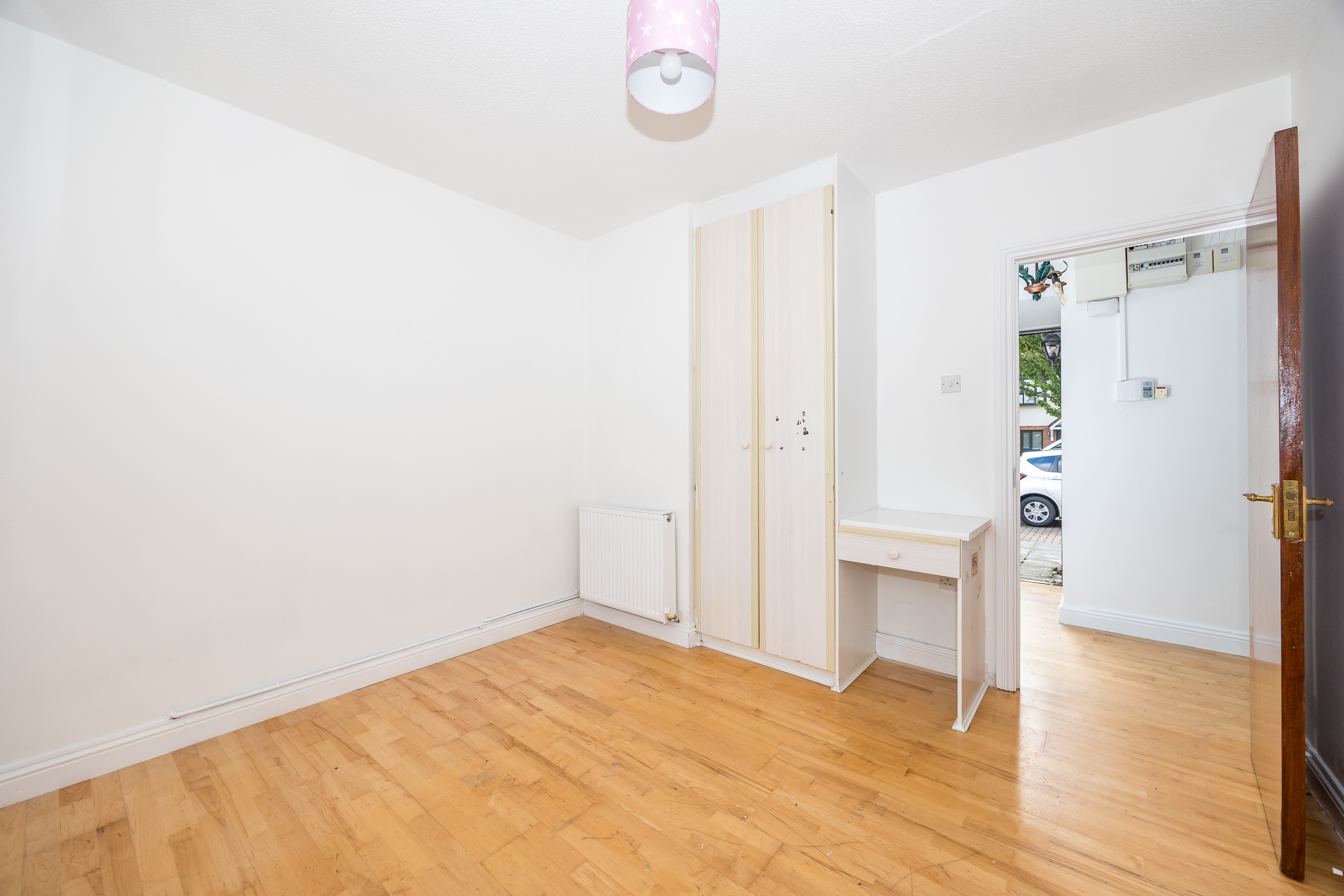 Wooden floor, ceiling light, curtain pole, built in wardrobe.