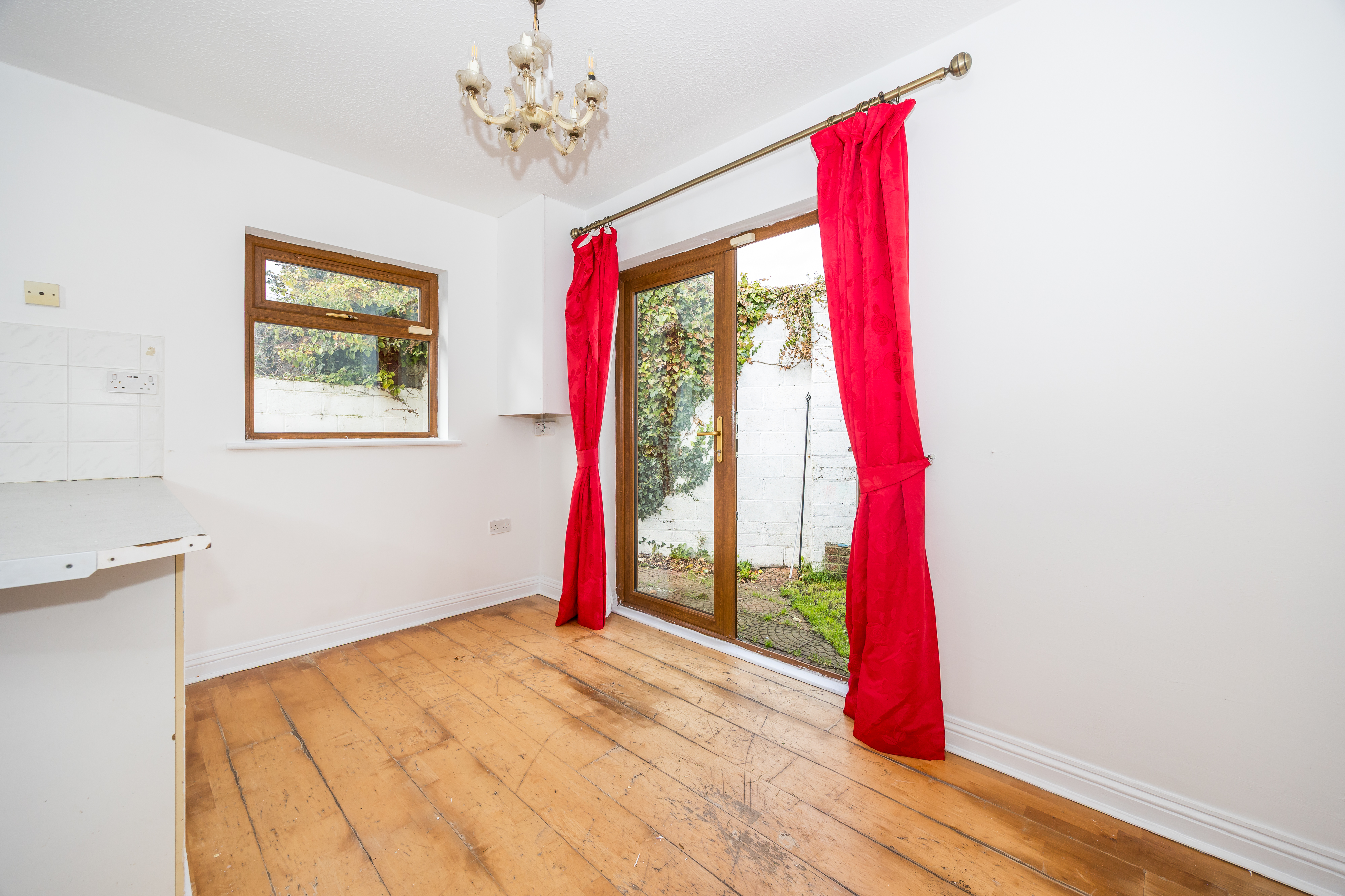 Tiled floor and wooden floor, built in wall and floor units, plumbed for dish washer, plumbed for washing machine, Nordmende oven, Beko four ring electric hob, extractor fan, stainless steel sink and draining board, gas boiler, ceiling lights, French doors to rear garden, curtain pole, heating control.