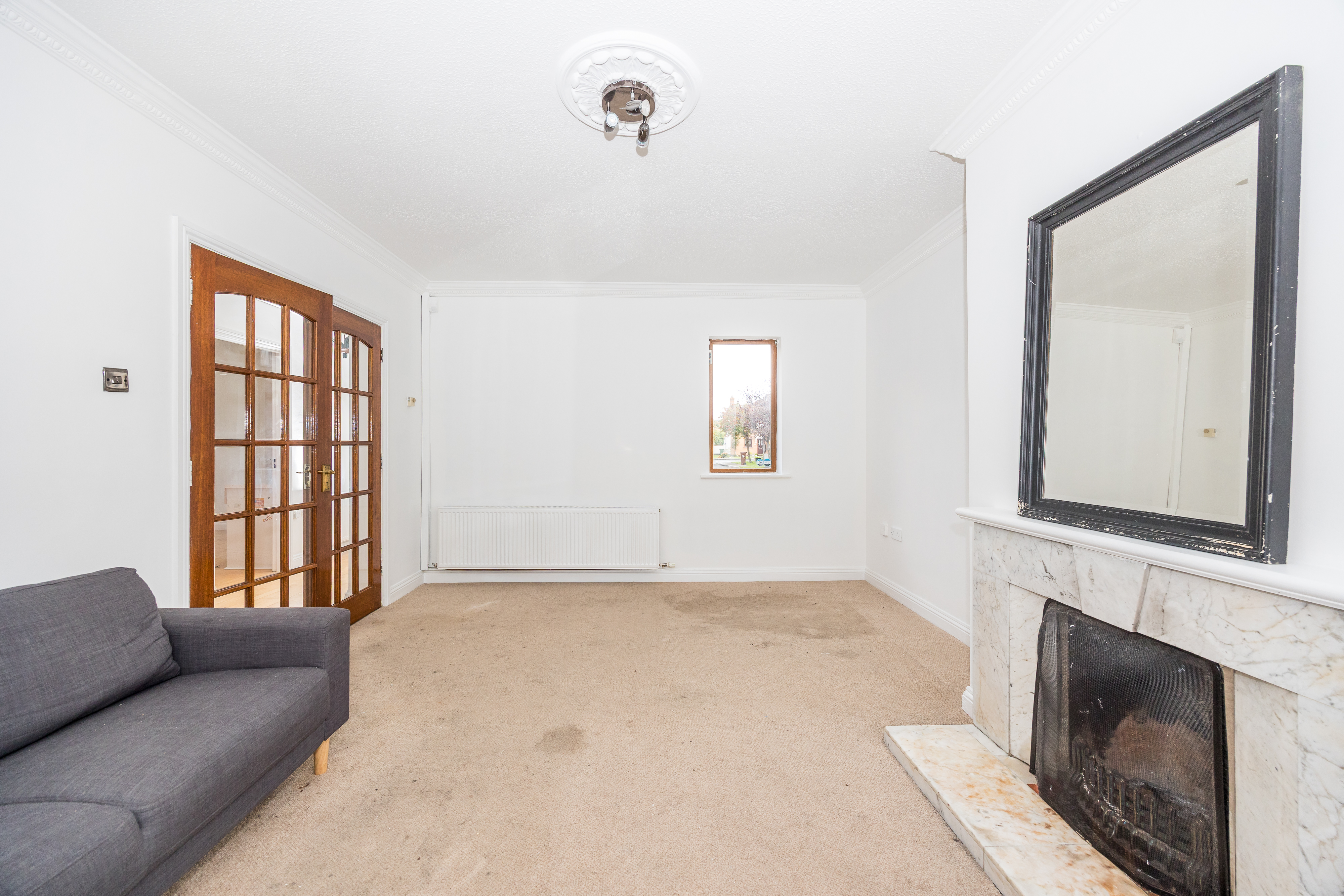 Carpet, marble fire surround & hearth, ceiling light.