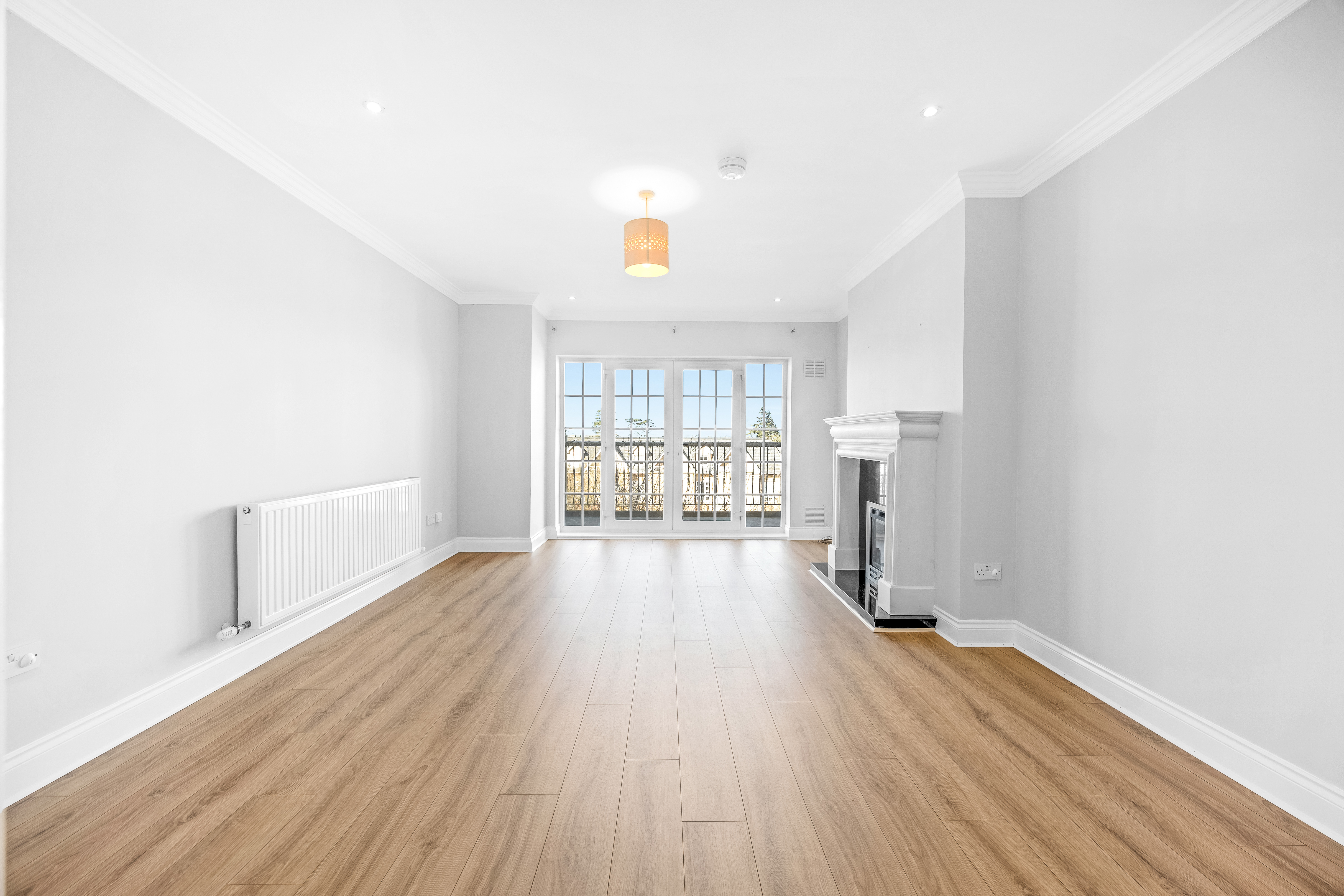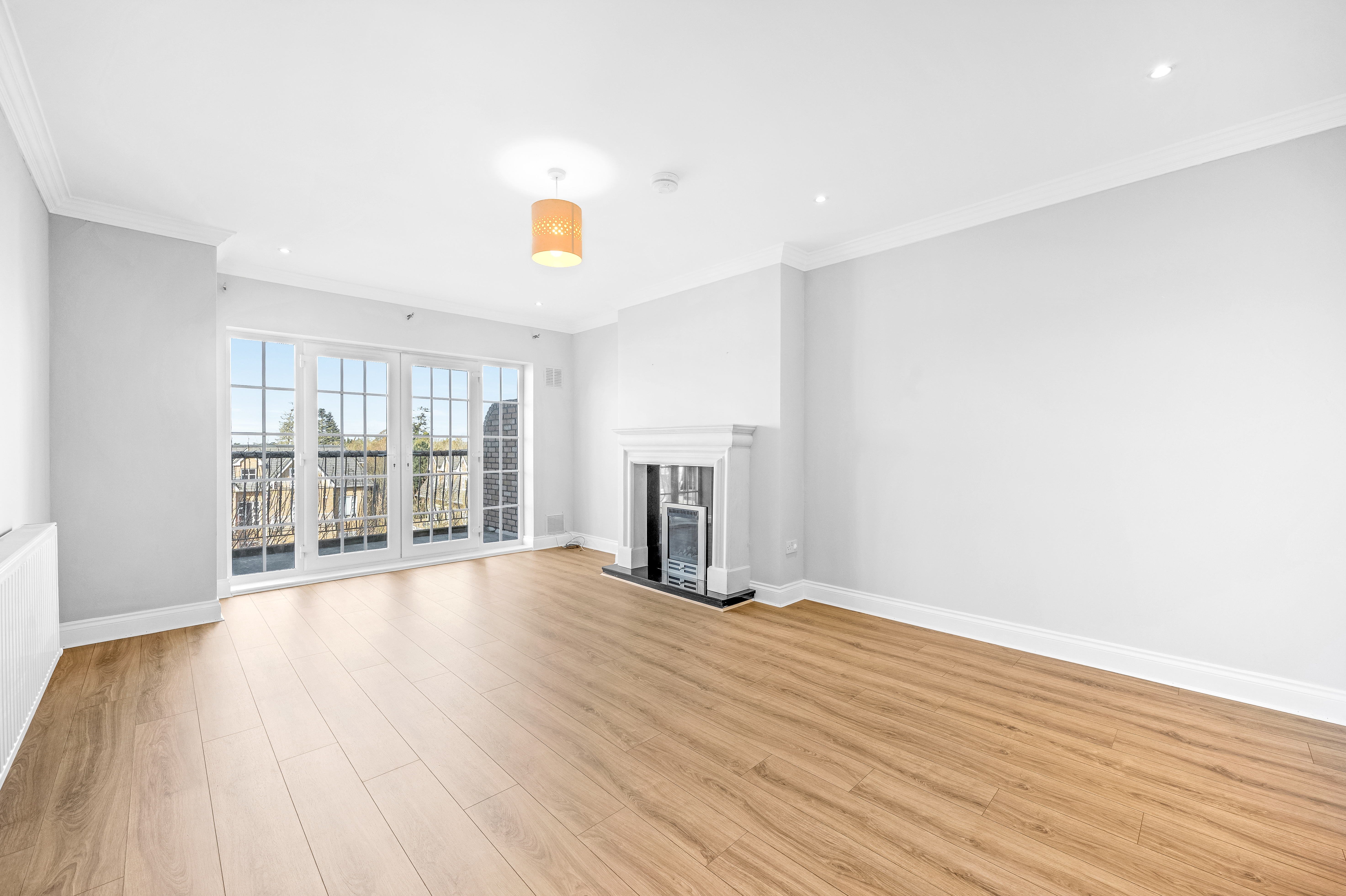 Laminate floor, ceiling light, recessed lighting, feature quartz fire surround with inset gas fire and granite hearth, French doors to balcony.