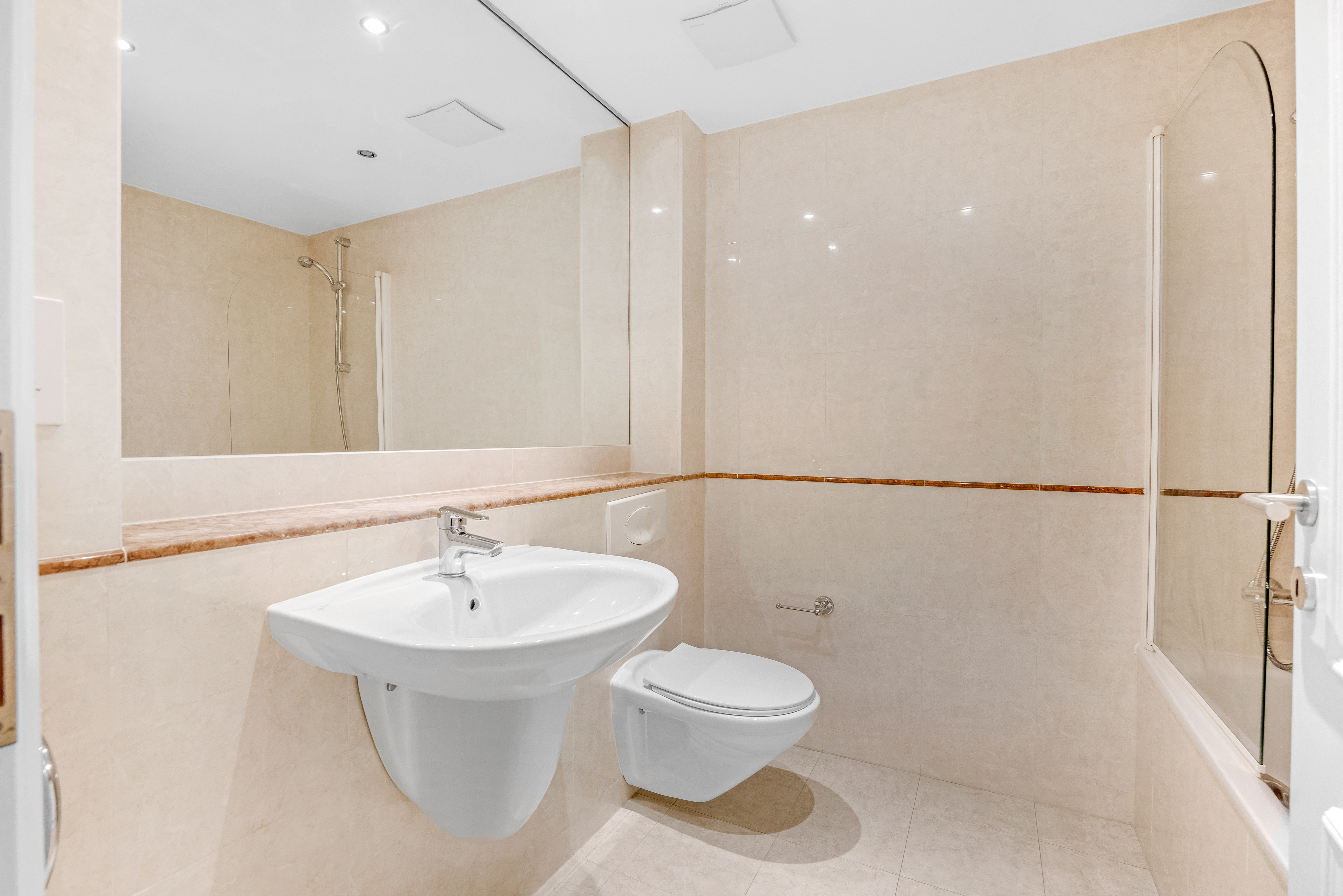 Tiled floor and walls, bath, bath screen, wall mounted sink, W.C, mirror, extractor fan, shaving light, recessed lighting, chrome towel ring.